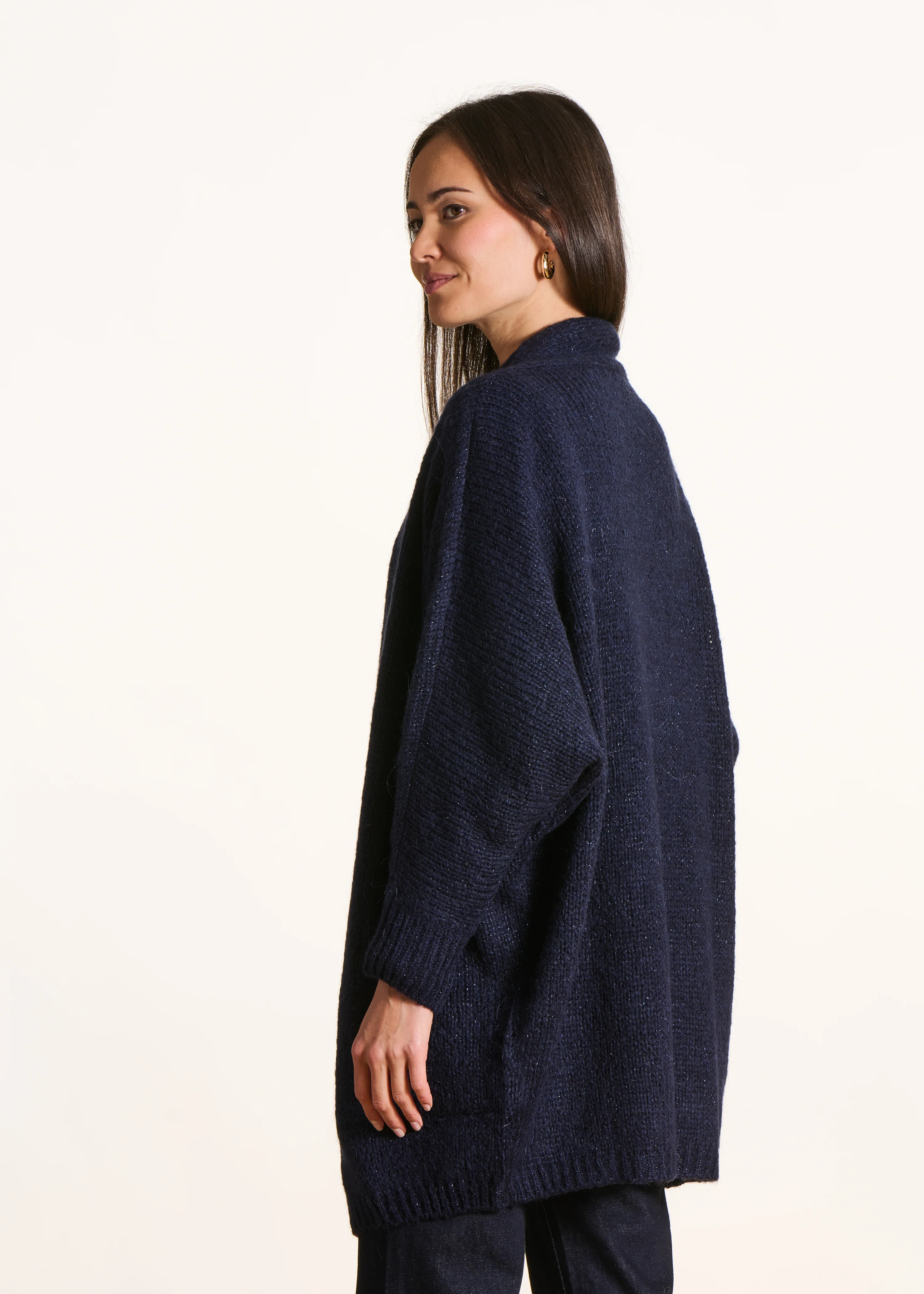 -70%Gilet mi-long bleu marine oversize en maille irisée—
