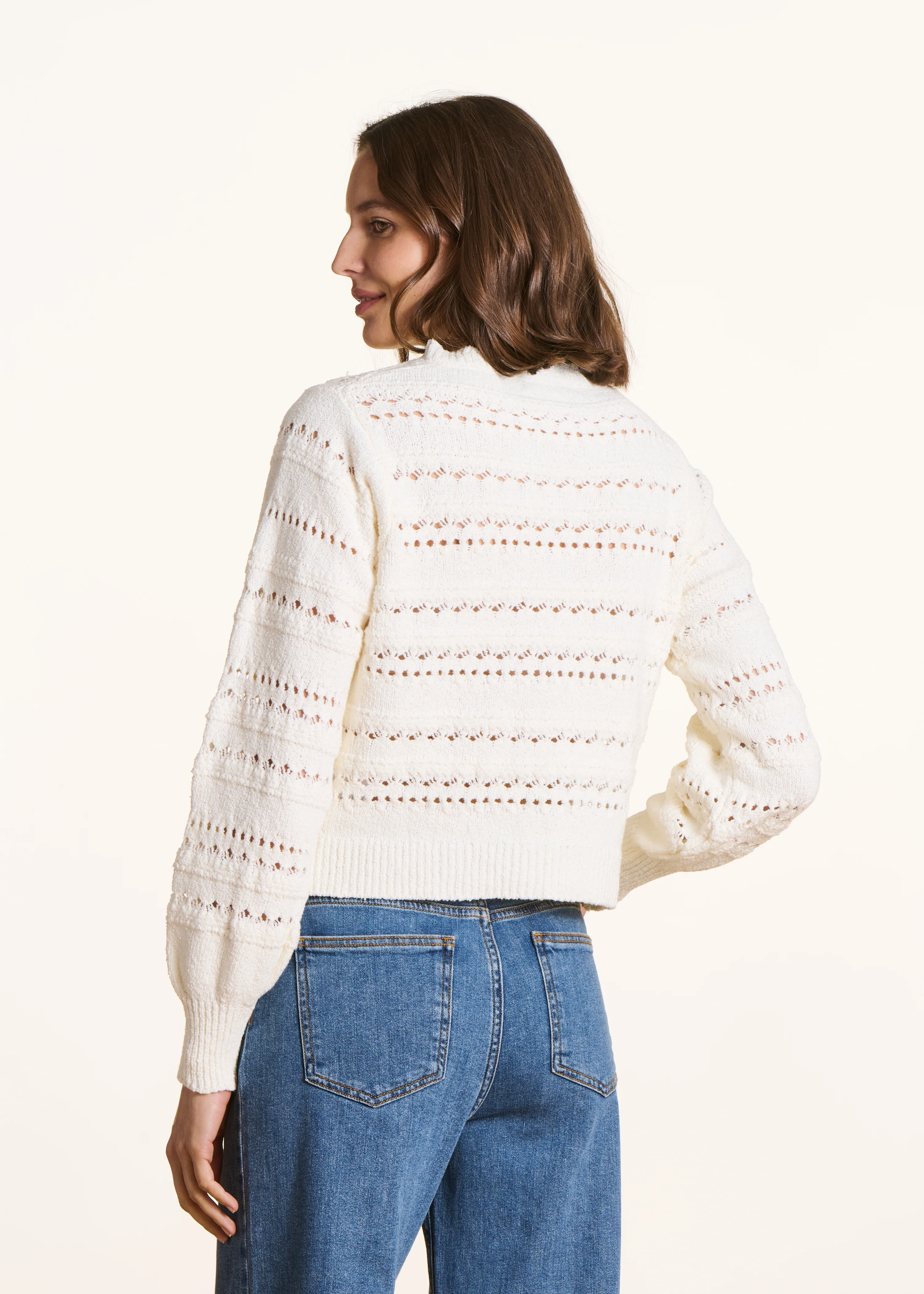 Gilet écru en maille ajourée boutons fantaisie
