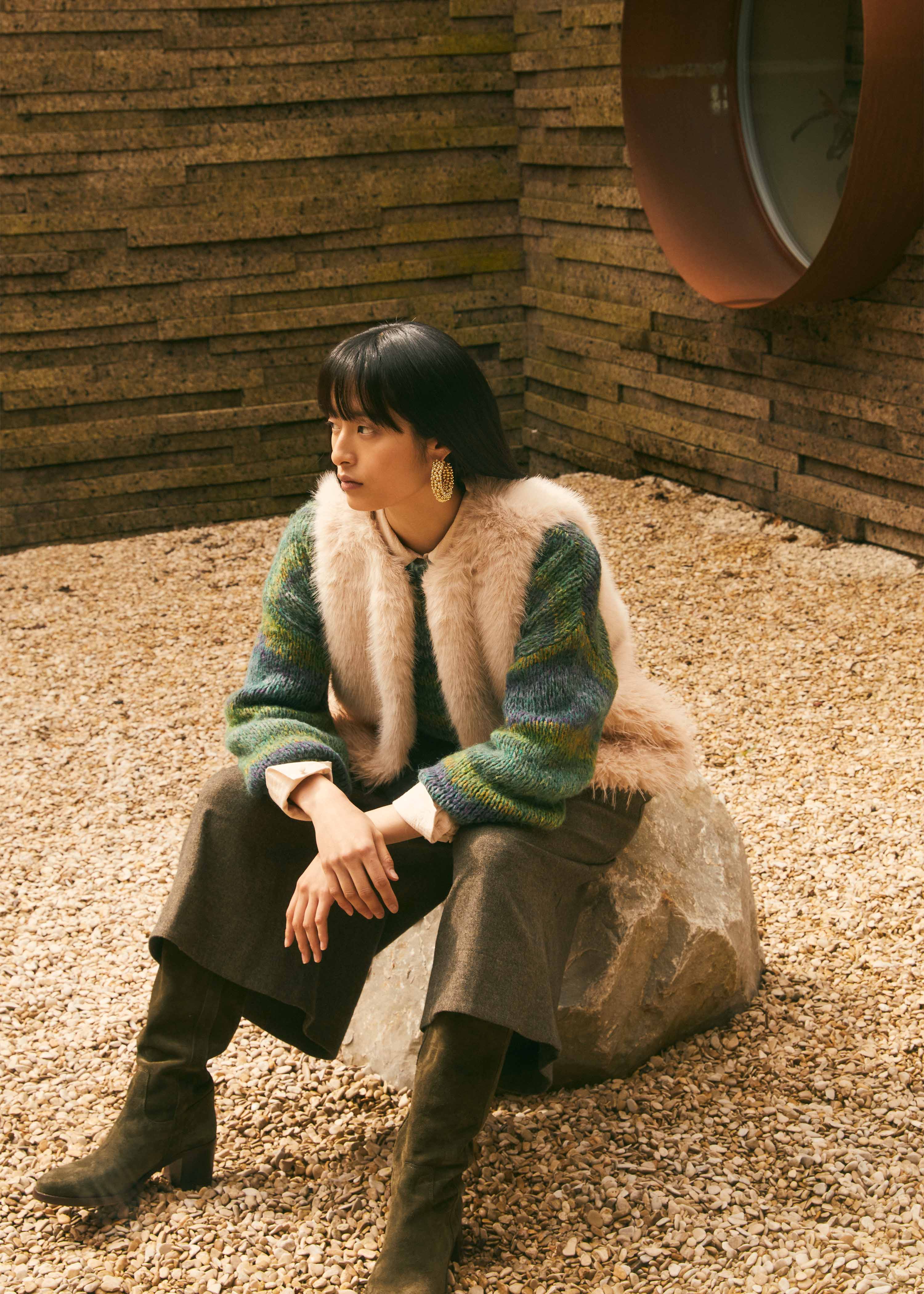 -70%Veste écrue courte sans manches patchwork fausse fourrure—