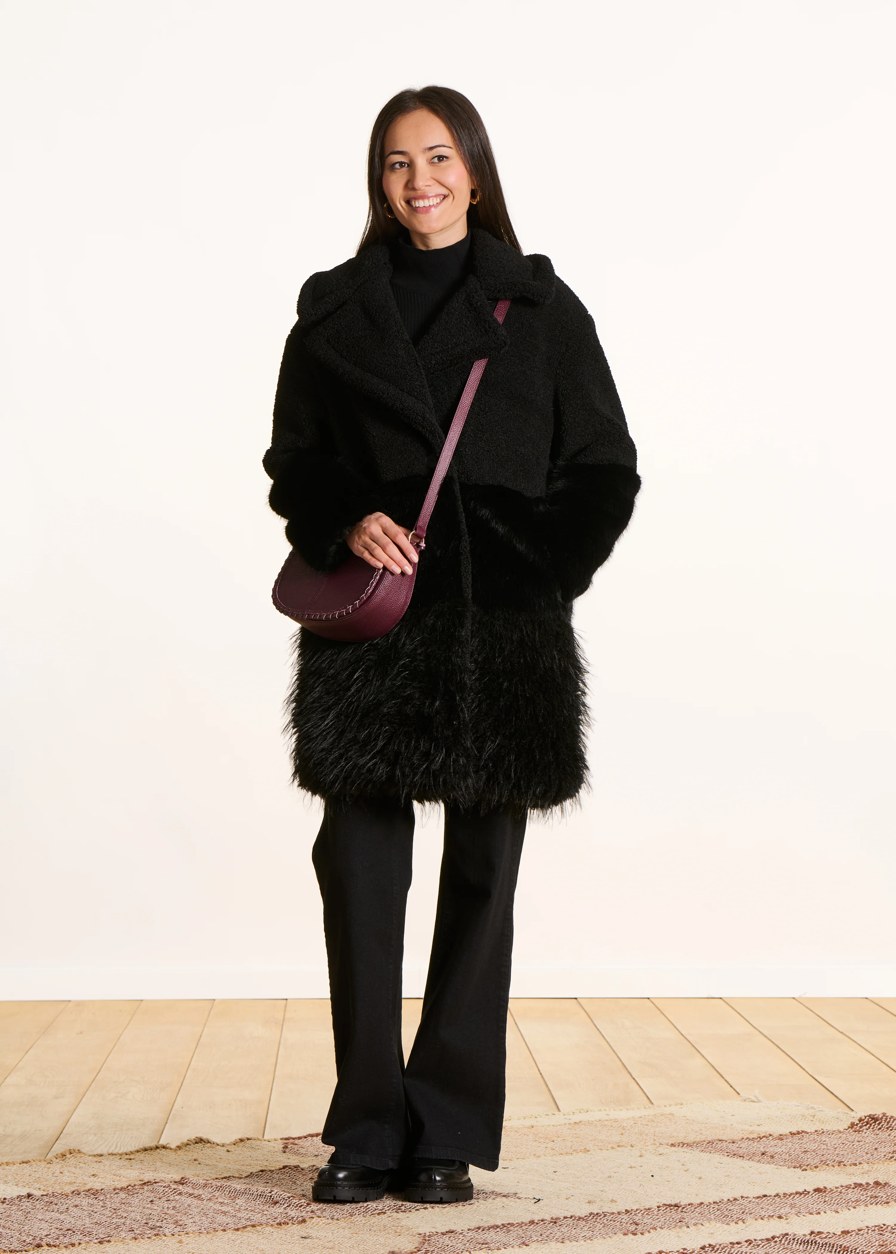 Manteau noir manches longues patchwork fausse fourrure