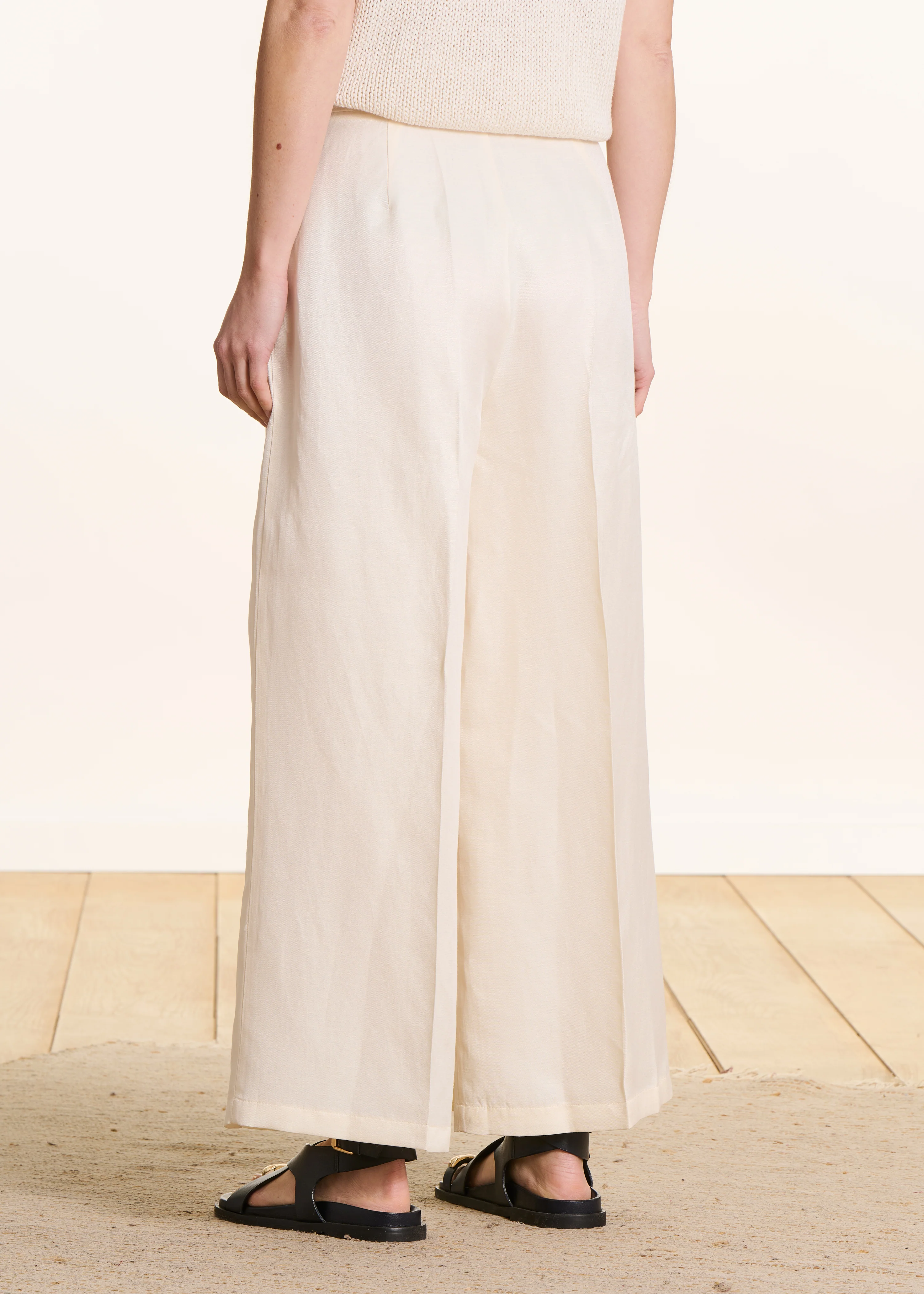 - Pantalon dans un tissu en lin mélangé légèrement brillant avec un pan qui se croise sur le devant
