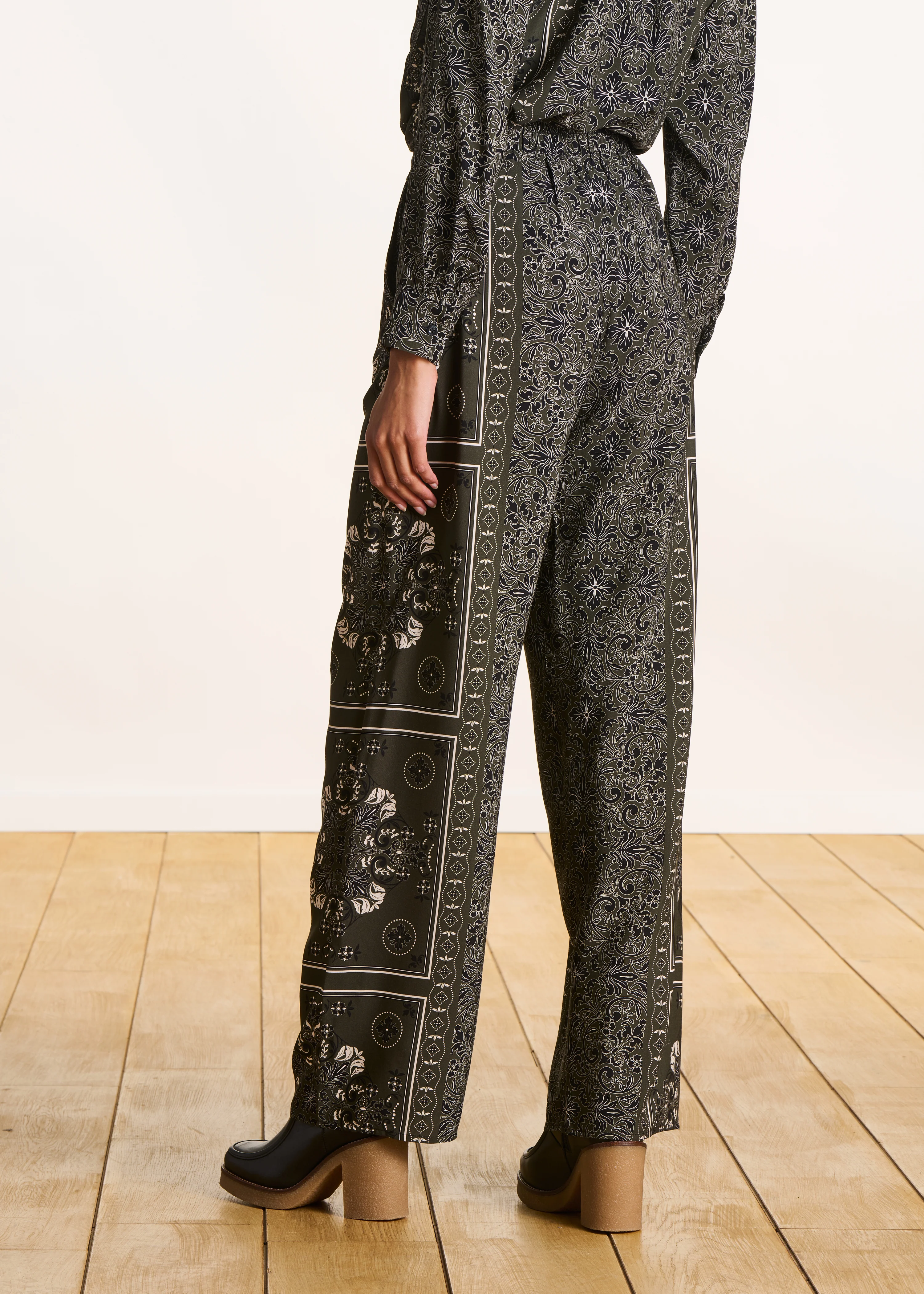 Pantalon fluide kaki à imprimé foulard taille élastique