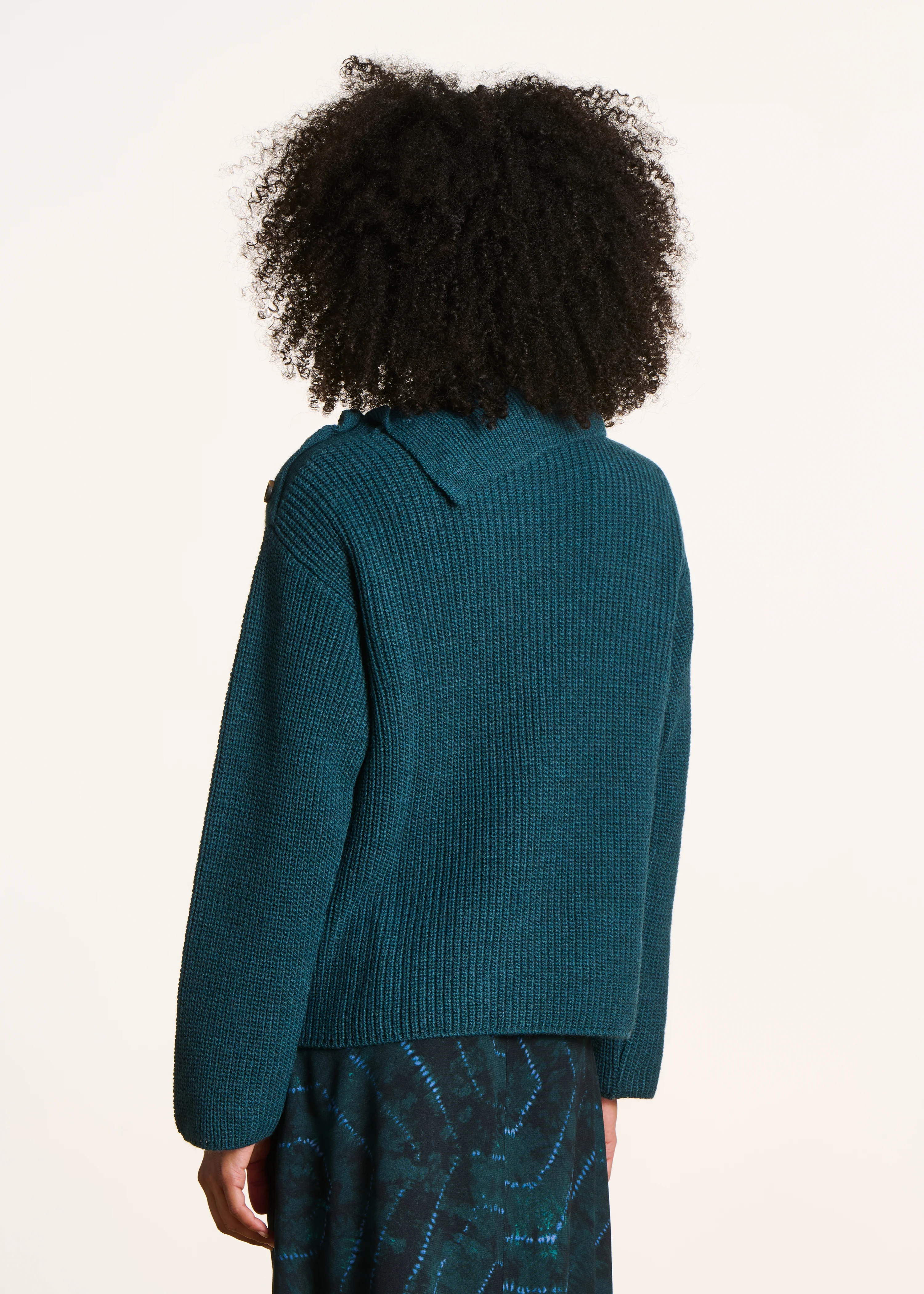-70%Pull bleu pétrole ample à manches longues col asymétrique—