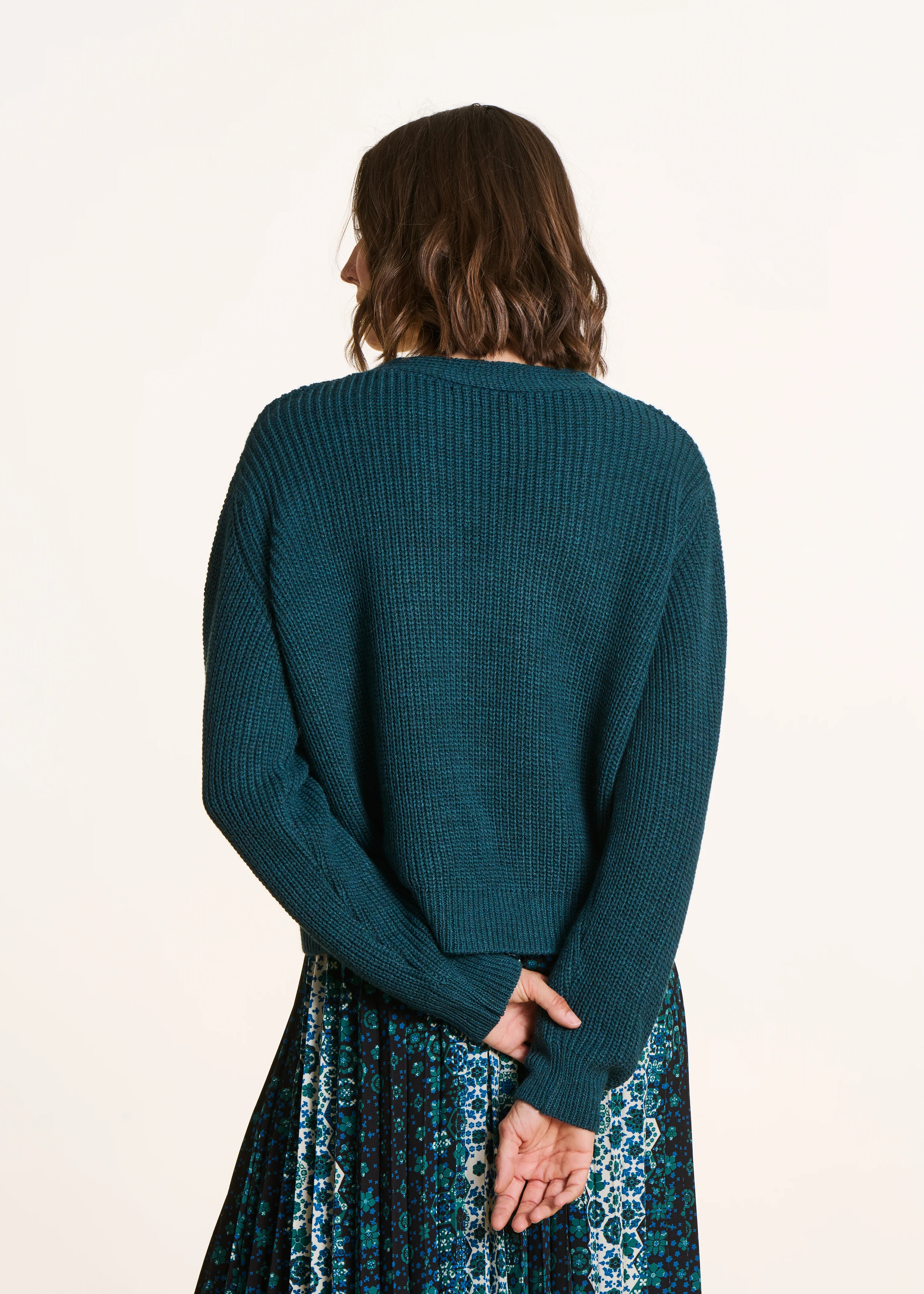 -70%Pull bleu pétrole en maille ample manches longues col V—