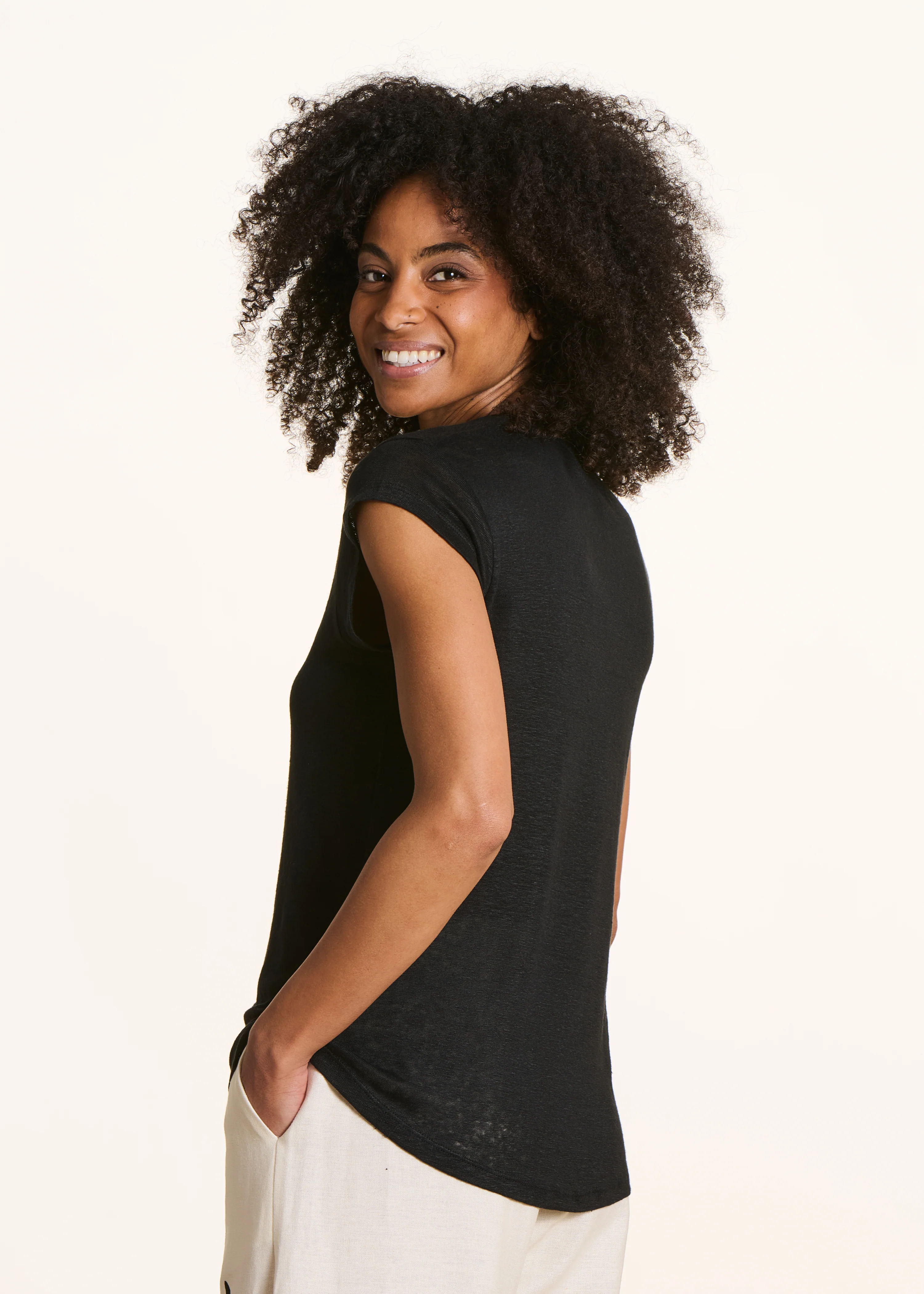 -70%T-shirt noir en lin manches courtes—